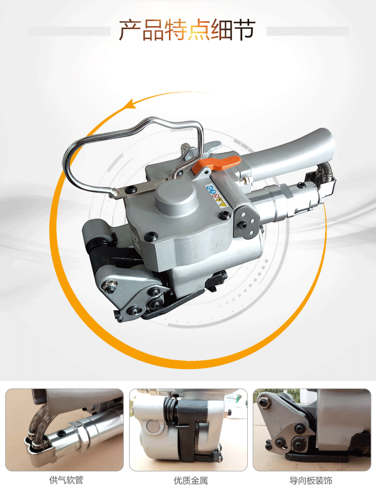 氣動塑鋼帶打包機是一種摩擦熔接型打包機,重疊的熱塑性PP/PET打包帶通過摩擦運動產生的熱量接合,因此稱為“摩擦熔接”。氣動打包機的動力是氣源,因此它能夠捆緊幾噸重的物體而不會散包。氣動打包機根據使用鐵扣分為氣動鐵扣式打包機和氣動免扣式打包機。 信耐包裝設計的兩款氣動打包機AQD-19型和AQD-25型使用方便、機重輕巧、氣動大功率設計;自動化程度高,拉緊、熔接殼控制性強;機器耐用度高,所有機體和構件均采用高強度合金材料、高可靠性設計、先進工藝制造;專利設計、使用安全、免疲勞設計。 1、氣動塑鋼帶打包機可水平或垂直通過平衡器或重型彈簧吊掛在可旋轉,可移動的橫梁上、上下操作可任意定位,使氣動鋼帶打包機有一定的工作空間(注:分離式不需要通過平衡器或彈簧吊掛裝置)。 2、使用氣動鋼帶打包機時,決不可用可燃氣體,空氣壓縮氣源必須通過油水分離器、壓力調節閥、油霧器,氣管最好是用外經12㎜,內經8㎜氣管,承受壓力為0.9Mpa,油霧器內加:22#氣輪機油、60-100號錠子油。 3、氣管的最大工作長度為10米,理想長度在5米內;氣動塑鋼帶打包機的工作摩擦輪壓下的正常工作間隙為0.1-0.3毫米。 4、氣動塑鋼帶打包機的各種運動部位保持潤滑。 5、若氣動打包機收緊力過大或者過小,可使用小螺絲刀調節氣動打包機的節流閥。調整時不分方向,轉速聲音越大,拉力越大,反之則小。 6、當氣動打包機使用頻率較高時,每天應在氣動打包機的進氣品滴專用潤滑油,保養機器在,保持6-8公斤的氣壓。 7、要使用氣動打包機前,要認真檢查空氣壓縮機是否正常工作。打包一般產品時,能保持6-8公斤的氣壓即可,打包鋁錠、玻璃產品時,若氣壓調整到9公斤,效果更佳。 8、油水分離器的潤滑器要保持油滿狀態,每天排空過濾器和空氣壓縮機儲氣罐里的水份。