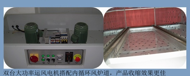 采用不銹鋼加熱管,替代早期石英管,適用壽命更長,大功率運(yùn)風(fēng)電機(jī),使收縮爐升溫快、風(fēng)量大、運(yùn)風(fēng)均勻,以達(dá)到最佳收縮效果〖可非標(biāo)定制〗