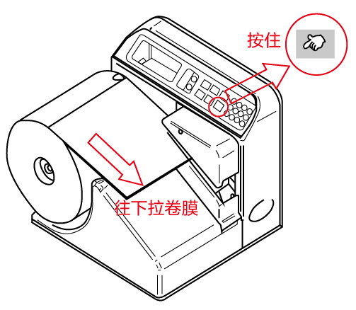 3)用手拉著卷膜進(jìn)氣孔完成進(jìn)入氣管頭后,直接穿入進(jìn)膜槽,然后,一手按著操作面板上黃色的“IN/OUT”(進(jìn)退膜)按鈕,另一手同時(shí)配合著將卷膜從槽內(nèi)拉出。