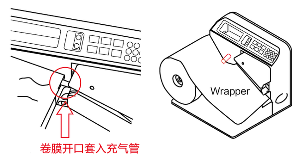 2)把卷膜的進(jìn)氣孔穿入設(shè)備的充氣孔,將膜拉入到進(jìn)膜槽。進(jìn)氣孔直接穿過設(shè)備的充氣金屬孔即可。