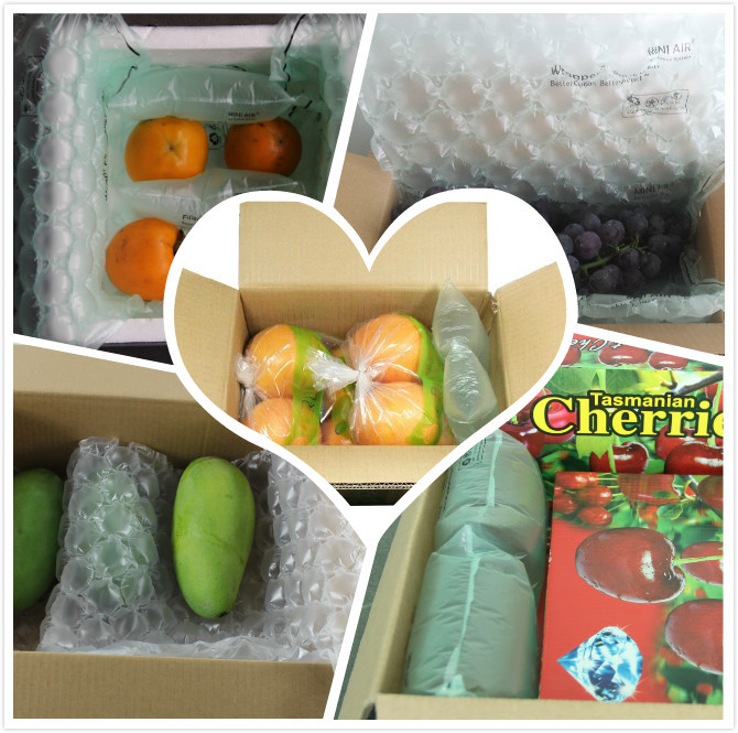目前常見的水果包裝有,泡沫包裝、珍珠棉包裝、瓦楞紙+珍珠棉網袋包裝及充氣袋包裝。泡沫包裝和保利龍包裝會占用商家很大的倉儲空間,皮薄的水果不適合使用。充氣袋是由PE膜制作而成,質地柔軟,充氣后有很好的緩沖減震效果,用于水果運輸包裝再合適不過。